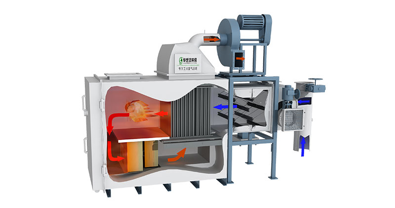 VOCs流向一:在脫附風機的帶動下,低濃度的VOCs氣體從分子篩轉輪的冷卻區進入1級換熱器冷側流道進行熱量交換,氣體溫度由60℃升高至200℃后流回分子篩轉輪的脫附扇區。高溫的氣體將大量的VOCs分子從分子篩轉輪的沸石分子表面脫附下來,形成高濃度的VOCs,濃度控制在10g/m3以下。
